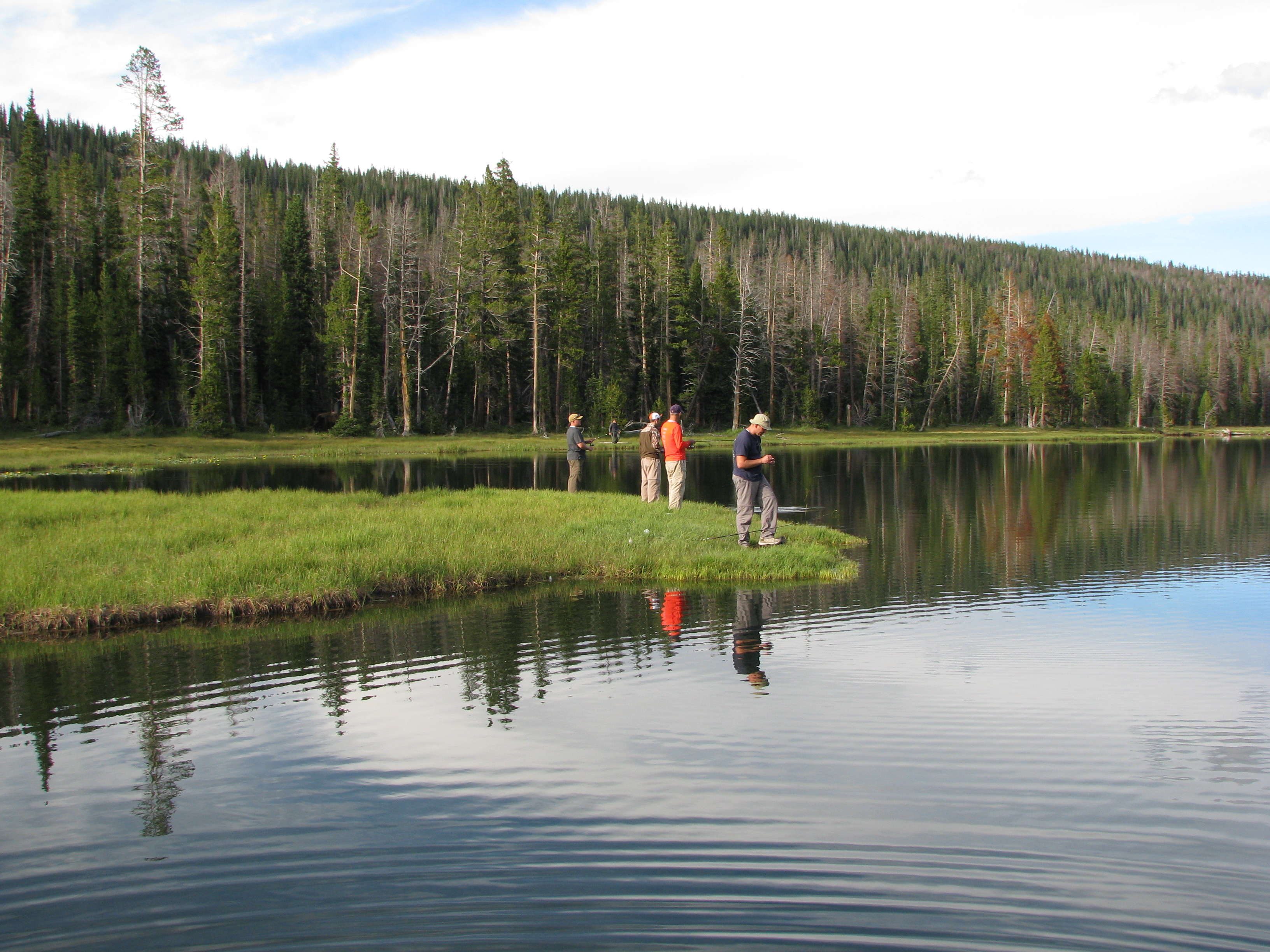 After restart, the group stayed together for much of the next three hours. “Catch me up on the last year” conversations were had while climbing switchbacks. After a while I started getting antsy again and picked up my pace. I knew our stopping point and decided to get there and setup camp for the group. However, a turn in the trail and a wrong intuition about the pitch of the trail ahead had me second guessing my route, so I decided to park it and wait. I was worried I had made a wrong turn. I knew I was near a patch of ponds that the group wanted to fish, so I waited on a rock while eating sunflower seeds. After what I thought was too much time, I walked back down the path to fortuitously find the group dropping packs and starting off trail to spend some time at the ponds. These ponds were really picturesque and offered a unique fishing experience similar to fishing on a floating island. The grass and dirt upon which we were standing was undercut by the water. The bank was overhung to produce a floating affect. This required that we spread our weight out, or water would seep up through the grass at our feet. Fishing was fast and furious, but only small fish just larger than fingerlings. Most of my success was with an assortment of panther martins and Jakes spinners.