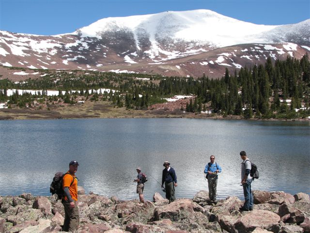 After Breakfast the next day the group put on their daypacks and made a later than normal start to fish at Atwood, Allred and Allen. Lake Atwood only seemed fruitful right at the dam, and nice sized fish were caught at a good frequency with Jakes and KastMasters of middle weights. As is the case with most fishing holes, after a while the frequency trailed off, and the group decided to move to the other lakes. Not as much success was had at either Allred or Allen, and by lunch the group had decided to deviate from the plan to stay the camp and opted to move it down to one of the chain lakes for an easier and shorter hike out the next day. The three brothers MSRH, Photoman, and Thumper had decided that today would be the day for a peak summit, and had already started climbing up the ridge to Mt. Emmons. Mr. Soccer and I wanted to fish at Roberts Lake because of the elevation, and also because of heard reports of the fishing quality in that lake. The Professor, Pop-Pop and the fathers decided to mosey back to camp, pack up, and slowly get back to one of the chain lakes and set up for the last night.