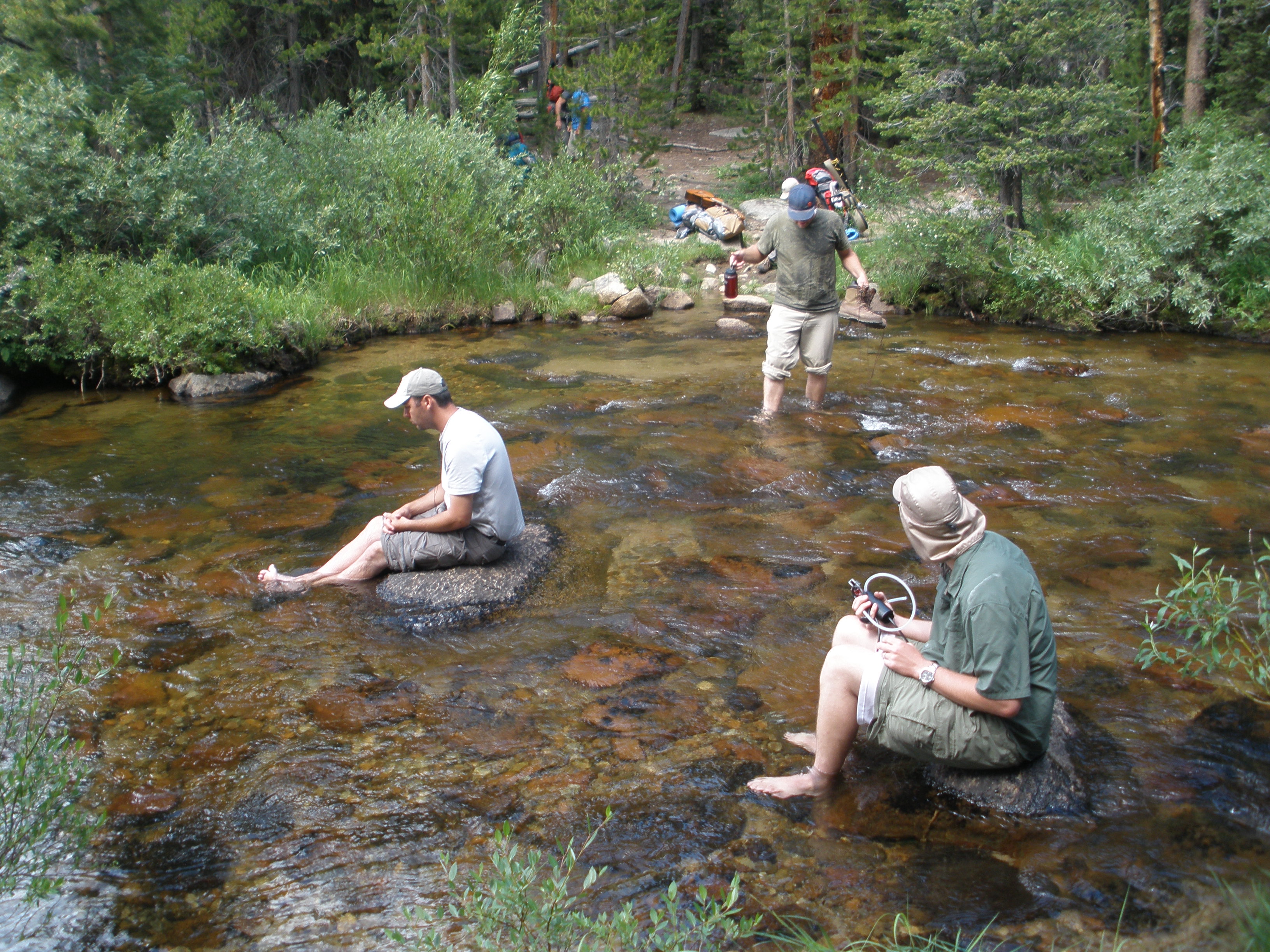 That second morning we started on the trail relatively early as we wanted to arrive at the clusters of larger lakes higher in the drainage system. No time was spent fishing at Raft Lake, but a break was taken overlooking it. This was the point when the group fully realized the distance and relative size of the area to be explored. Upon continuing we found the trail fairly technical and with the altitude it quickly drained the collective energy of the group. A few river crossings slowed things down a bit as well, but the group was prepared with water ready shoes, or some just went barefoot. The frigid water was a stark and welcome contrast to the high temperatures inside the hiking boots of the moment and a few extra minutes were used to bask and bathe. By mid-afternoon, camp was once again ready to be set up and a concealed place near the shore of the upper no name lake was selected. Fishing at the inlet to the lower no name lake was profitable and the group soon had enough fish for the evening meal.